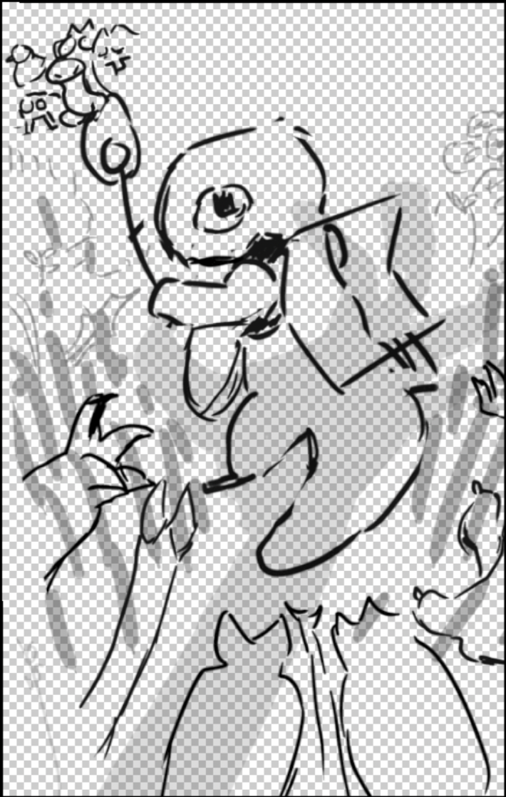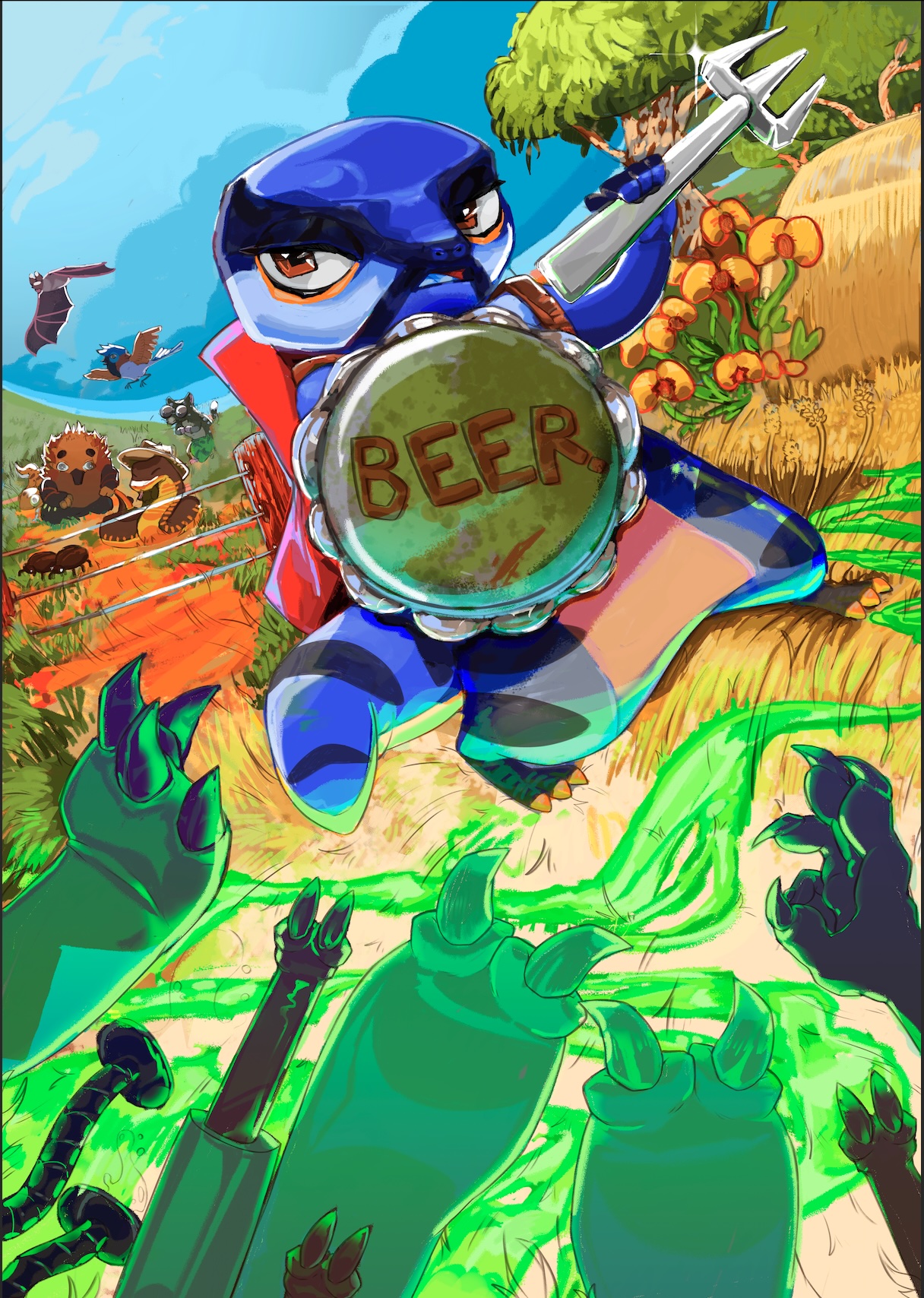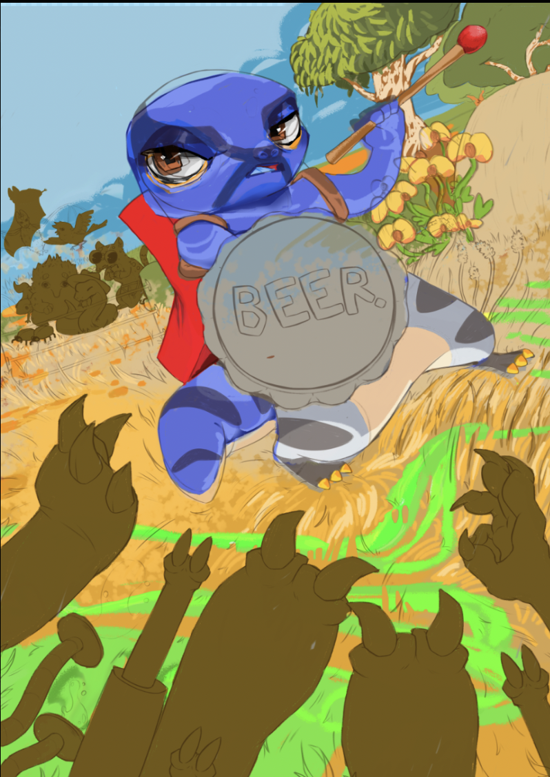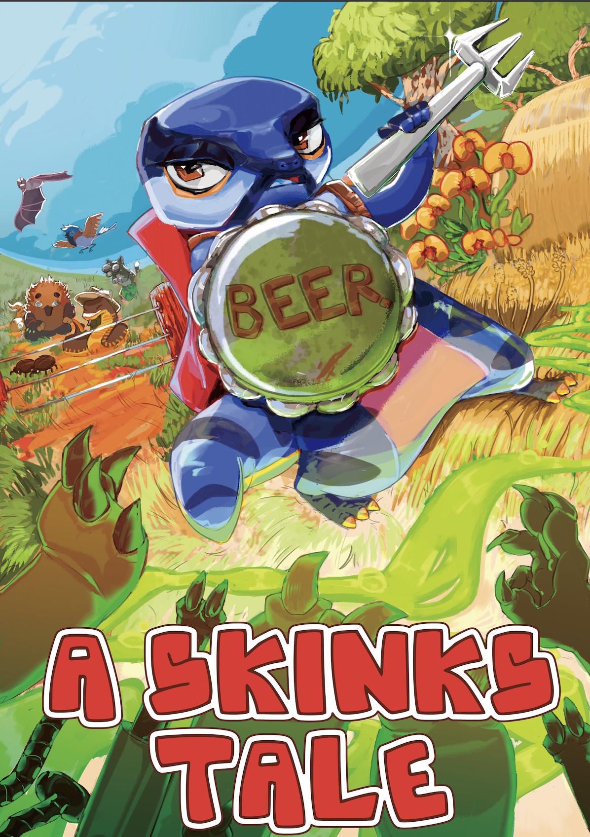 Our poster started with rough composing, deciding how to pose and include everything important to A Skink's Tale, whilst still leaving enough room for passers-by to want more. We wanted a sketchy style with little blending, the sharper outlines are more reflective on the in-game pixel art and lend it a whimsier style if you ask me:)